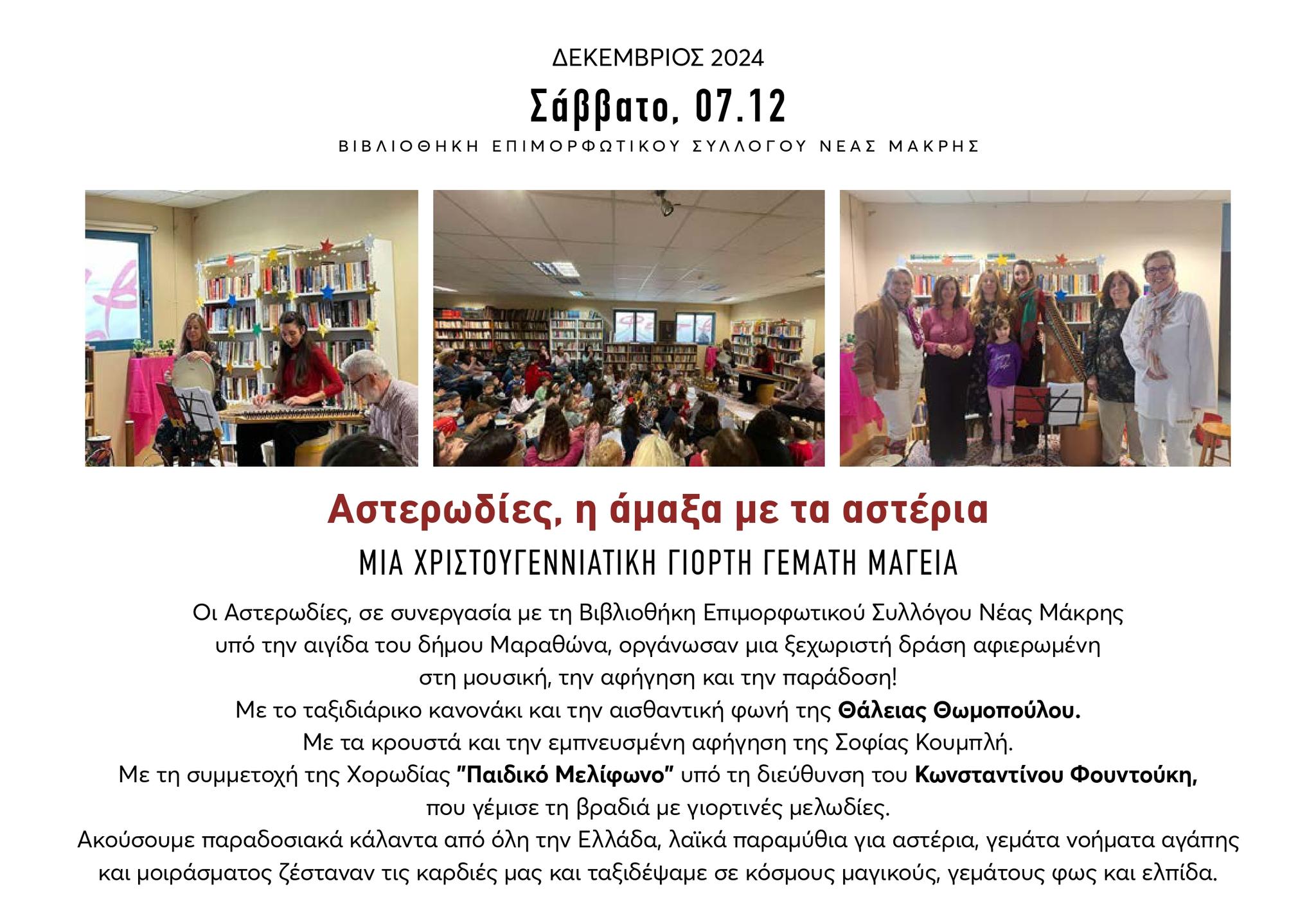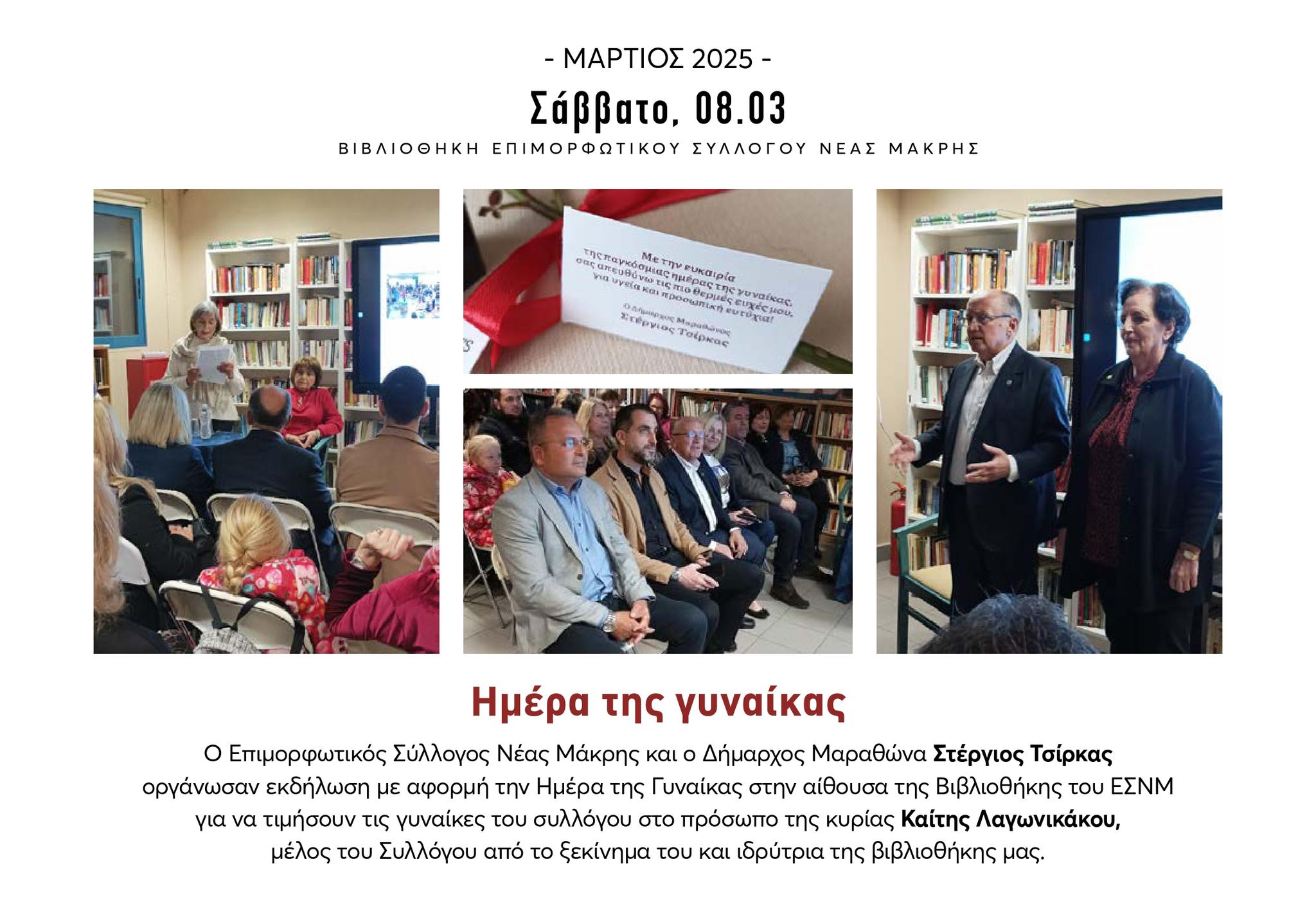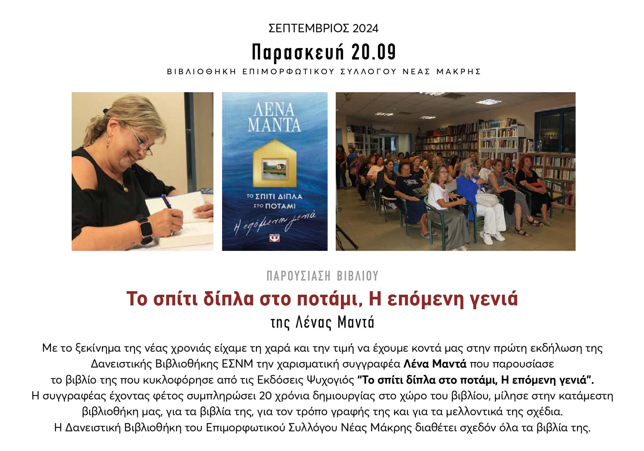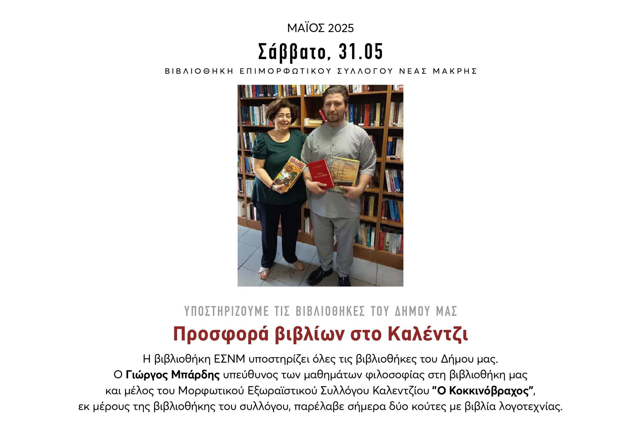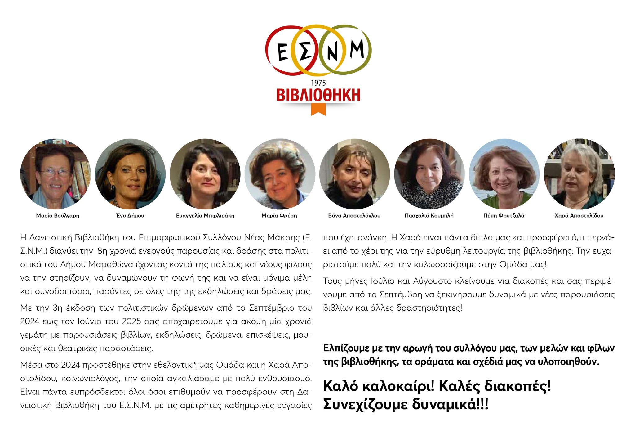 Η Δανειστική Βιβλιοθήκη του Επιμορφωτικού Συλλόγου Νέας Μάκρης, διανύοντας την όγδοη χρονιά της, συνέχισε δυναμικά τη συμβολή της στα πολιτιστικά δρώμενα του Δήμου Μαραθώνα, με σταθερή παρουσία παλιών και νέων μελών και εθελοντών. Η περίοδος Σεπτεμβρίου 2024 – Ιουνίου 2025 χαρακτηρίστηκε από πλούσια δράση, ποικιλία εκδηλώσεων και ανοιχτό πνεύμα συνεργασίας.