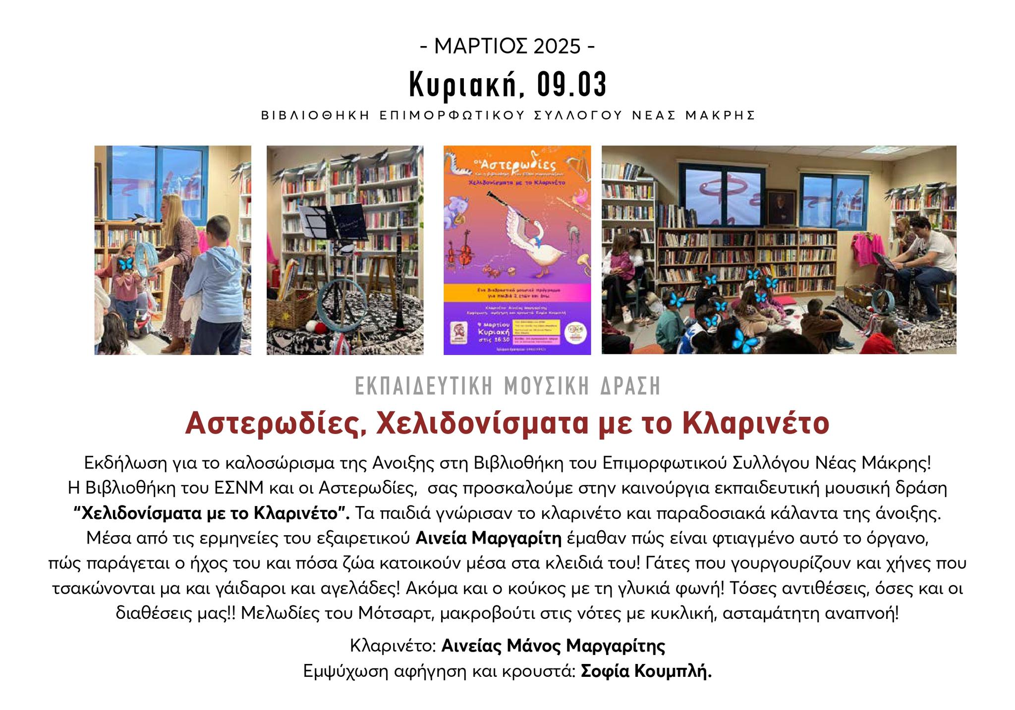 - Εκπαιδευτικές και βιωματικές δράσεις για παιδιά, όπως τα «Χελιδονίσματα με το Κλαρινέτο», που συνδύασαν τη μουσική με τη μάθηση και το παιχνίδι.