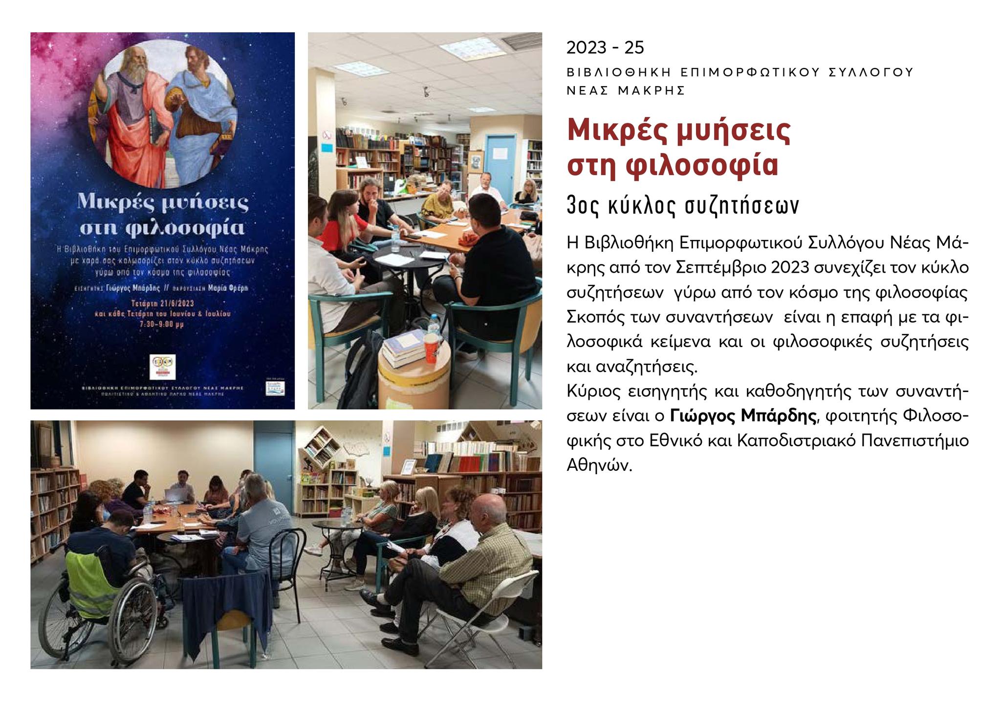 - Συνεχιζόμενη φιλοσοφική αναζήτηση: Ο τρίτος κύκλος των «Μικρών Μυήσεων στη Φιλοσοφία» συνέχισε να εμπλουτίζει το πνευματικό πεδίο των μελών.