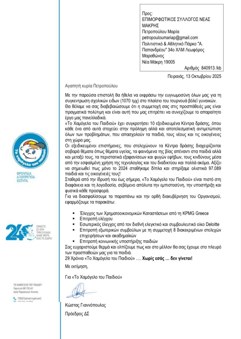 ΕΥΧΑΡΙΣΤΗΡΙΟ ΑΠΟ «ΤΟ ΧΑΜΟΓΕΛΟ ΤΟΥ ΠΑΙΔΙΟΥ» ΓΙΑ ΤΗ ΣΥΓΚΕΝΤΡΩΣΗ ΣΧΟΛΙΚΩΝ ΕΙΔΩΝ ΣΤΟ ΤΟΥΡΝΟΥΑ ΒΟΛΕΙ