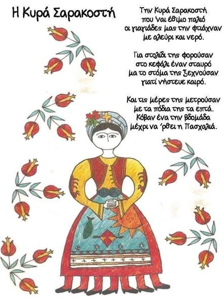 Και να'σου και η «κυρα-Σαρακοστή», μια μακριά γυναίκα που έχει ένα σταυρό στο κεφάλι και δεν έχει στόμα .Με τα χέρια της σταυρωμένα για τις προσευχές, με επτά πόδια για τις επτά εβδομάδες της νηστείας που κάθε Σάββατο κόβουν το ένα πόδι και το τελευταίο το έκοβαν το Μ.Σάββατο και το έκρυβαν σε ένα ξερό σύκο ή σε ένα καρύδι ( όποιος το έβρισκε ήταν ο τυχερός της επόμενης χρονιάς).